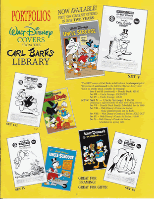 SET I & II - The portfolio of art contained in this envelope reproduces sixty covers from The Carl Barks Library of Walt Disney's Donald Duck (Sets I & II), which originally appeared on Donald Duck Four Color and Donald Duck comic books from 1942-1969. Twenty-four of these covers appear in a large 12 ¼” X 8 5/8” format for the first time. Every effort has been made to make these untrimmed recreations look as if Carl Barks, or the original artists who drew them had also done their own coloring.