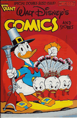 Double-Sized Issue! Front cover by Carl Barks; Donald Duck in “Turkey Trouble” by Carl Barks; Chip ‘N’ Dale by Jack Bradbury; Gremlins by Walt Kelly; Scamp in “Heroic Pup” by Al Hubbard; Grandma Duck by Carl Barks; Mickey Mouse in “The Great Stamp Hunt” by Carl Fallberg and Paul Murry. $5.00